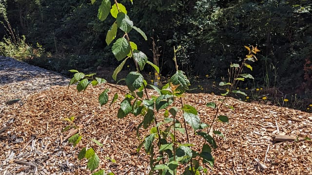 Our rainwater catchment system is also a success story. We have not captured much this summer of course, but we have plenty stored from last winter and we have well back up so we continue to use these water sources for kitchen use, laundry, our shower (no bath or dishwasher here), and outside hose hookups. Our beautiful graywater system which is fed by all our water usage flows into tanks and is then distributed to our 130-foot (39.6 meter) graywater field, where we are currently growing 11 different fruit and nut trees. We have never watered those trees and after only 9 months, you can see the growth in the video. We usually have deer-proof cages around the trees and are just in the process of making larger ones as the trees continue to grow even bigger.